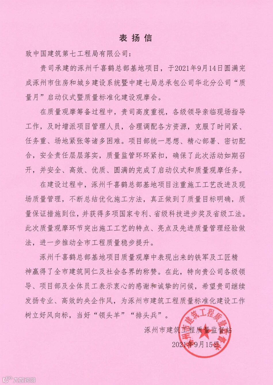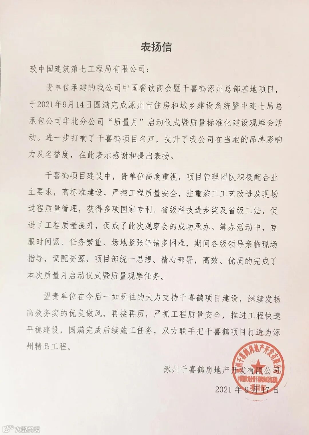日前,华北分公司涿州千喜鹤项目接连收到当地政府主管部门及业主发来的表扬信,对该项目圆满完成涿州市住房和城乡建设系统暨中建七局总承包公司华北分公司“质量月”启动仪式暨质量标准化建设观摩会提出表扬。