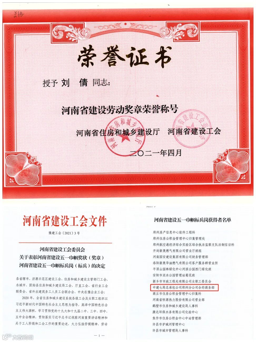 二是助力女职工建功立业。动员女职工积极投身到争当“五一巾帼标兵”、争创“五一巾帼标兵岗”活动中来,刘倩通过竞赛取得河南省住建系统技能竞赛资料员第一名的优异成绩,荣获河南省劳动建设奖章。商务合约部荣获2021年河南省“五一巾帼标兵岗”、人力资源部荣获公司级“女职工标兵岗”荣誉称号。