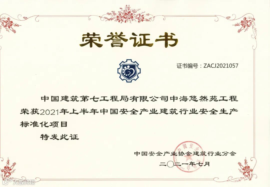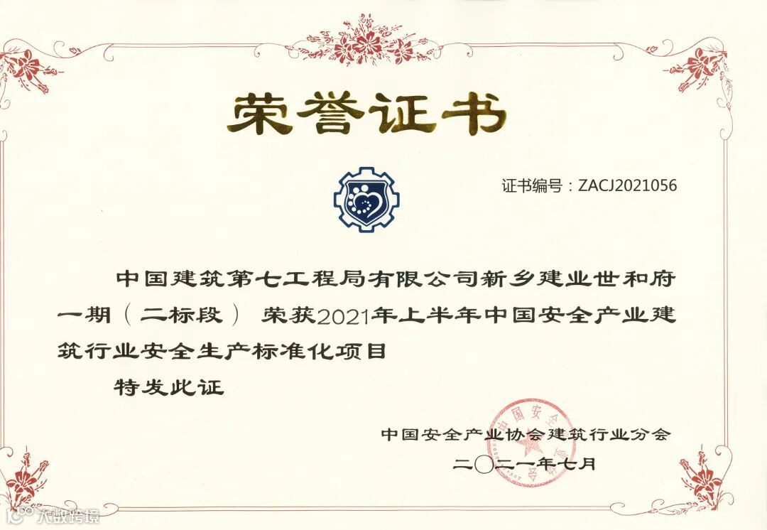 新乡建业世和府一期(二标段)、中海悠然苑等2个项目荣获2021年上半年中国安全产业建筑行业安全生产标准化项目。