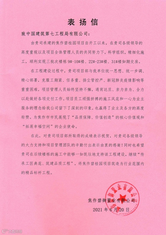 2021年以来,长葛建业城项目获得市级最美工地称号,焦作碧桂园项目获得市级建筑领域质量安全管理先进单位,漯河建业花园里项目获得市级扬尘污染治理工作先进集体,长葛建业城、新乡建业世和府等5个项目举办3次市级以上观摩、1次公司级观摩,品牌影响力显著提升。全年受到表彰45次,收到表扬信39封,奖牌加锦旗8个。