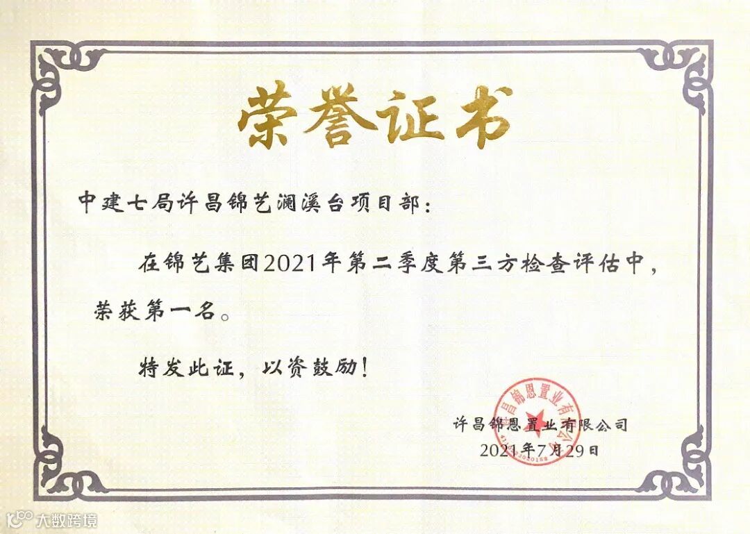 许昌锦艺澜溪台项目在锦艺集团对全国所属的18个地块的第二季度质量、安全综合评估中获得第一名的好成绩。