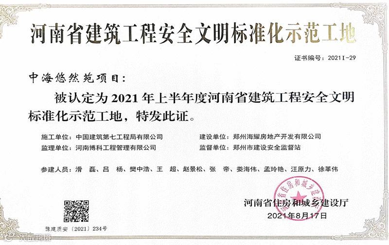 新乡建业世和府一期(二标段)、郑州航空港经济综合实验区(郑州新郑综合保税区)河东第一棚户区5号地、中海悠然苑、郑州同新实业有限公司城市综合体、禹州嘉誉府、新乡碧桂园时代城、驻马店示范区绿地酒店等7个项目荣获河南省安全文明标准化示范工地称号;杲村财富中心、洛阳华耀城等8个项目荣获第八届河南省土木建筑科学技术奖(建设安全);此外,新乡碧桂园时代城、商丘中建观湖宸府等6个项目获得市级安全文明工地称号。
