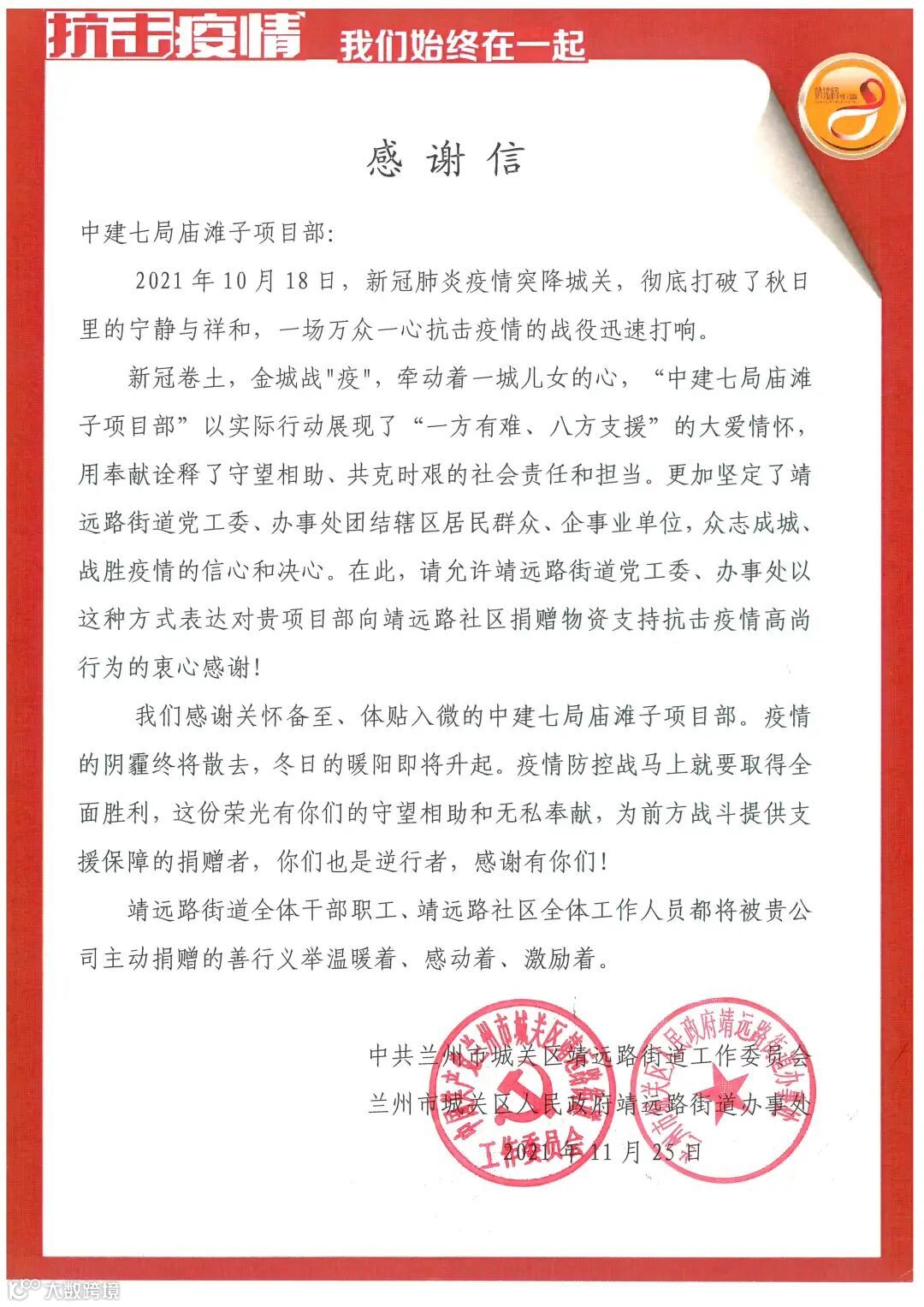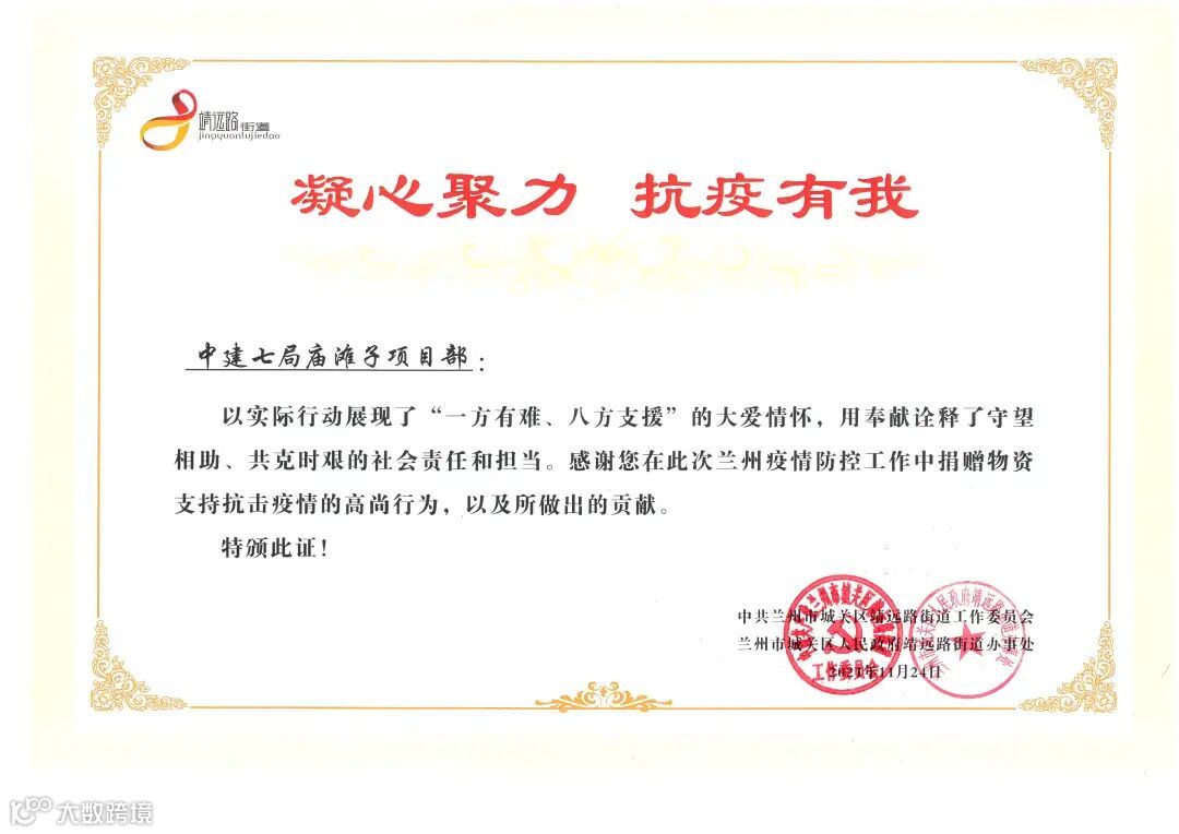 近日,华北分公司兰州庙滩子项目收到驻地靖远路街道党工委、办事处联合颁发的荣誉证书及感谢信,感谢项目部在此次兰州疫情防控工作中捐赠物资支持抗击疫情的高尚行为,以及坚守一线并肩作战所作出的贡献。信中充分肯定了该项目在抗击疫情期间以实际行动展现的“一方有难、八方支援”的大爱情怀及守望相助、共克时艰的社会责任和担当。