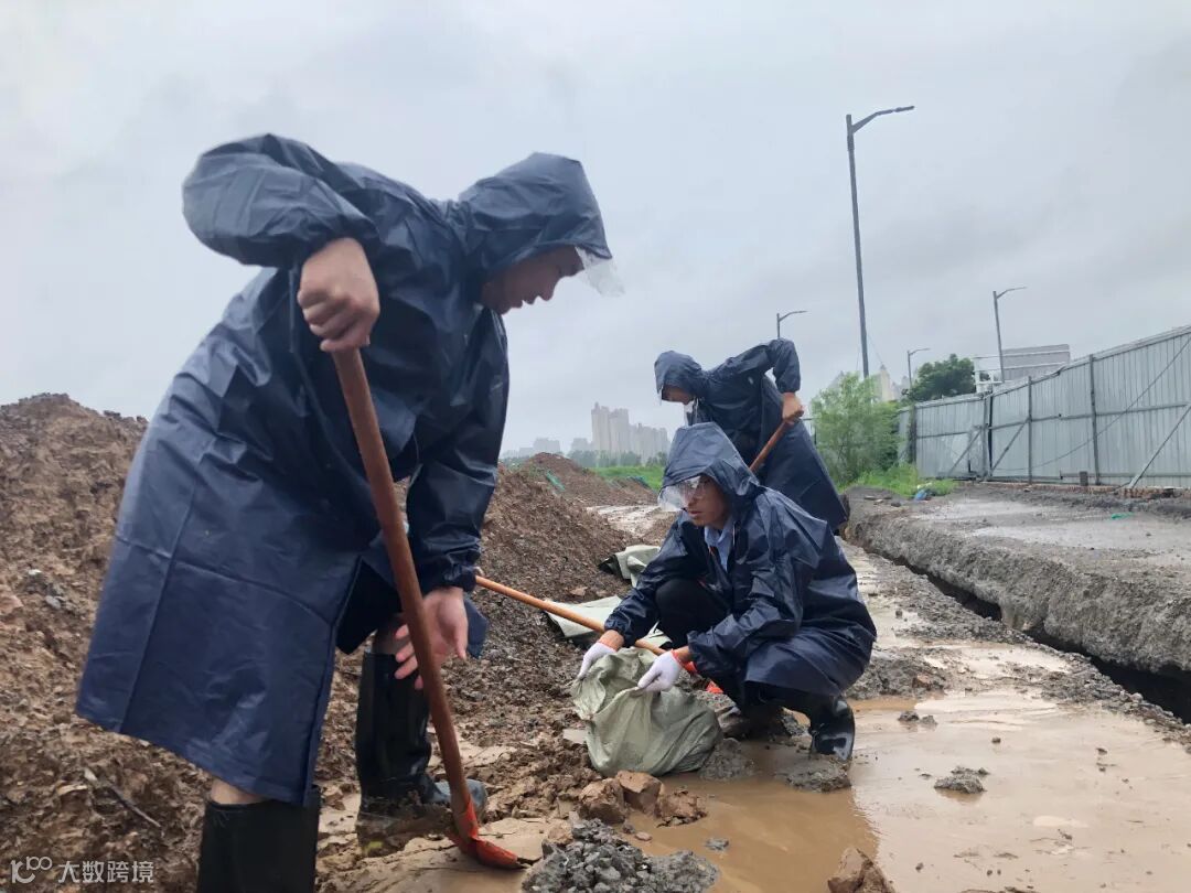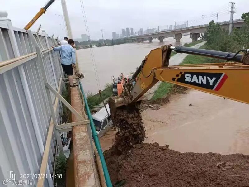 7月21日中午,河南省住房和城乡建设厅发出求助:象湖桥下贾鲁河被雨水冲出豁口,需要人员和设备紧急救援!得到消息的总承包公司数字小镇项目火速成立了由6人组成的青年突击队,带着一台钩机、一台平板车、两辆拉土车,赶往决堤现场。此时,贾鲁河的水已经与堤面完全齐平,决口处水流湍急,距离决堤口约70米的地方就是居民小区,且象湖桥与郑开大道的连接处完全浸泡在水里,如果再不止住险情,此处路基将因长时间浸泡出现下陷情况,郑开大道路面下陷对于郑州市交通、救援抢险无疑是雪上加霜。在执行推土填补方案失败后,突击队联合附近河南科技馆打开围挡,缩短了沙袋运送距离,成功修建成了一面坡形“保护墙”,暂时控制了险情,为后续的防汛工作奠定了强力保障。