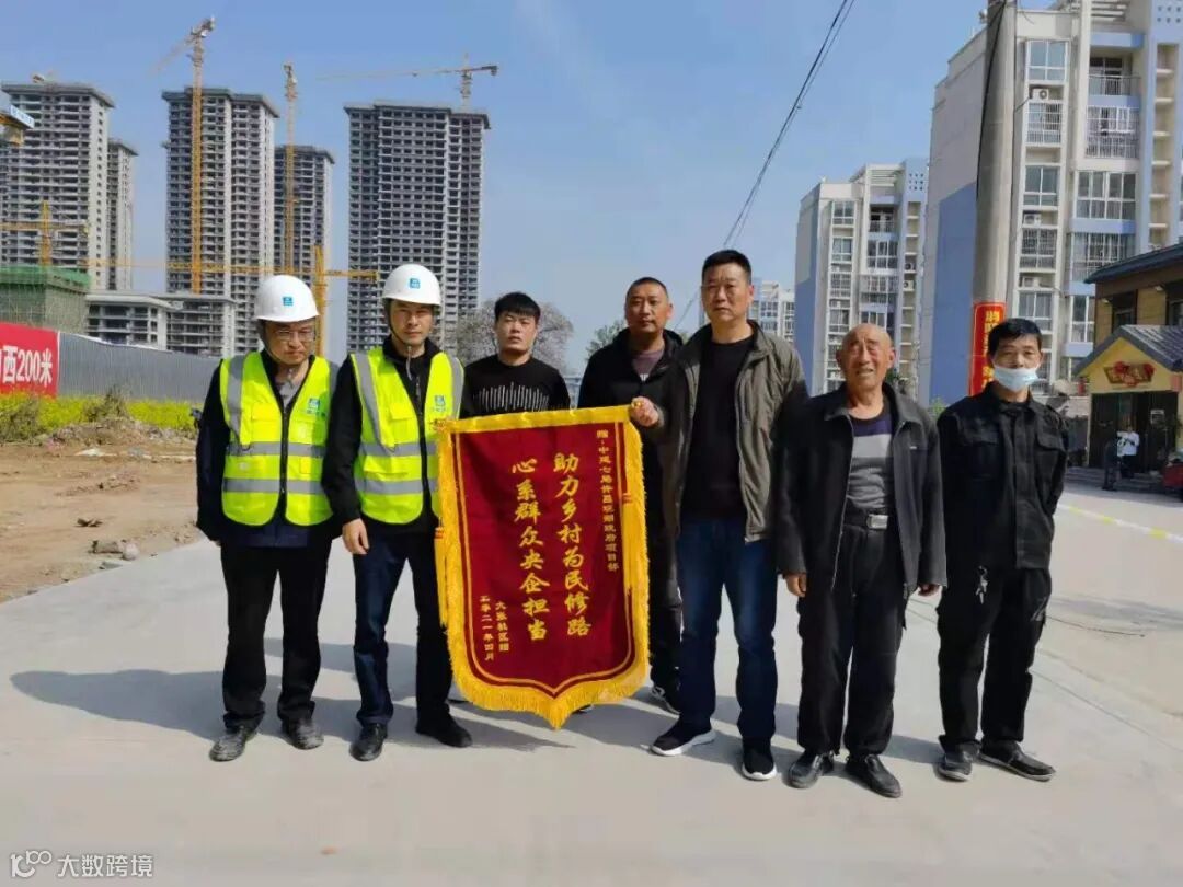 中建观湖·珑府项目在施工期间,免费为驻地附近的贫困村大张村修缮进村道路,修缮投入资金约26万元,该道路已于4月9日正式竣工。当地村支部代表在竣工当天为项目党支部送上锦旗,以表达村民的感谢之情。