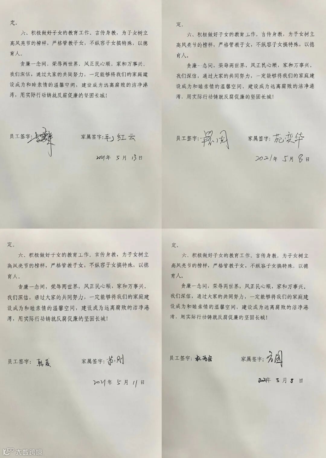 结合近年来各地查处的典型案例,组织员工从个人成长进步、经济利益、家庭幸福、人身自由等四个方面进行分析讨论,增强拒腐防变意识,并签订廉洁承诺。