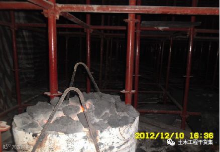 3)暖棚法比较适合易于封闭的结构,通过保证暖棚内的温度(各测点的温度不得低于5℃)进行混凝土养护,通长采取的升温方式有火炉升温、电暖器、电热风等加热方式;加热过程中应监测混凝土不得失水现象,否则应及时采取增湿措施或表面洒水养护。
