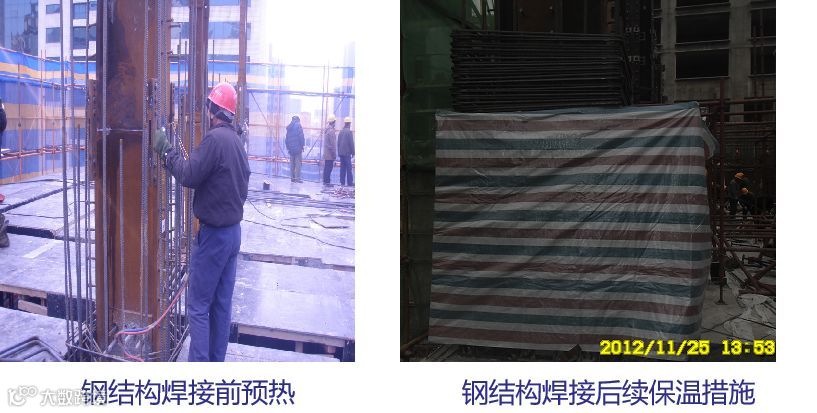 6)、在负温下露天焊接钢结构时,应考虑雨、雪和风的影响。当焊接场地环境温度低于-10℃时,应考虑焊接区域的保温措施;当焊接场地环境温度低于-30℃时,宜搭设临时防护棚。禁止雨水、雪花飘落在尚未冷却的焊缝上。