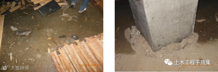 北方地区某项目,基础形式为独立承台桩基础,防水板为400mm,柱距为9.2m*8m,未设地梁。该工程于2011年10月开始动工,,11月施工至地下室封闭,回填土完成,在地下室顶板上洞口及地下室顶板采用600厚珍珠岩覆盖,2012年3月准备重新开工,检查中发现大量地下水上返至地下室,见下左图,框架柱根部沿根部产生裂缝,见下右图。