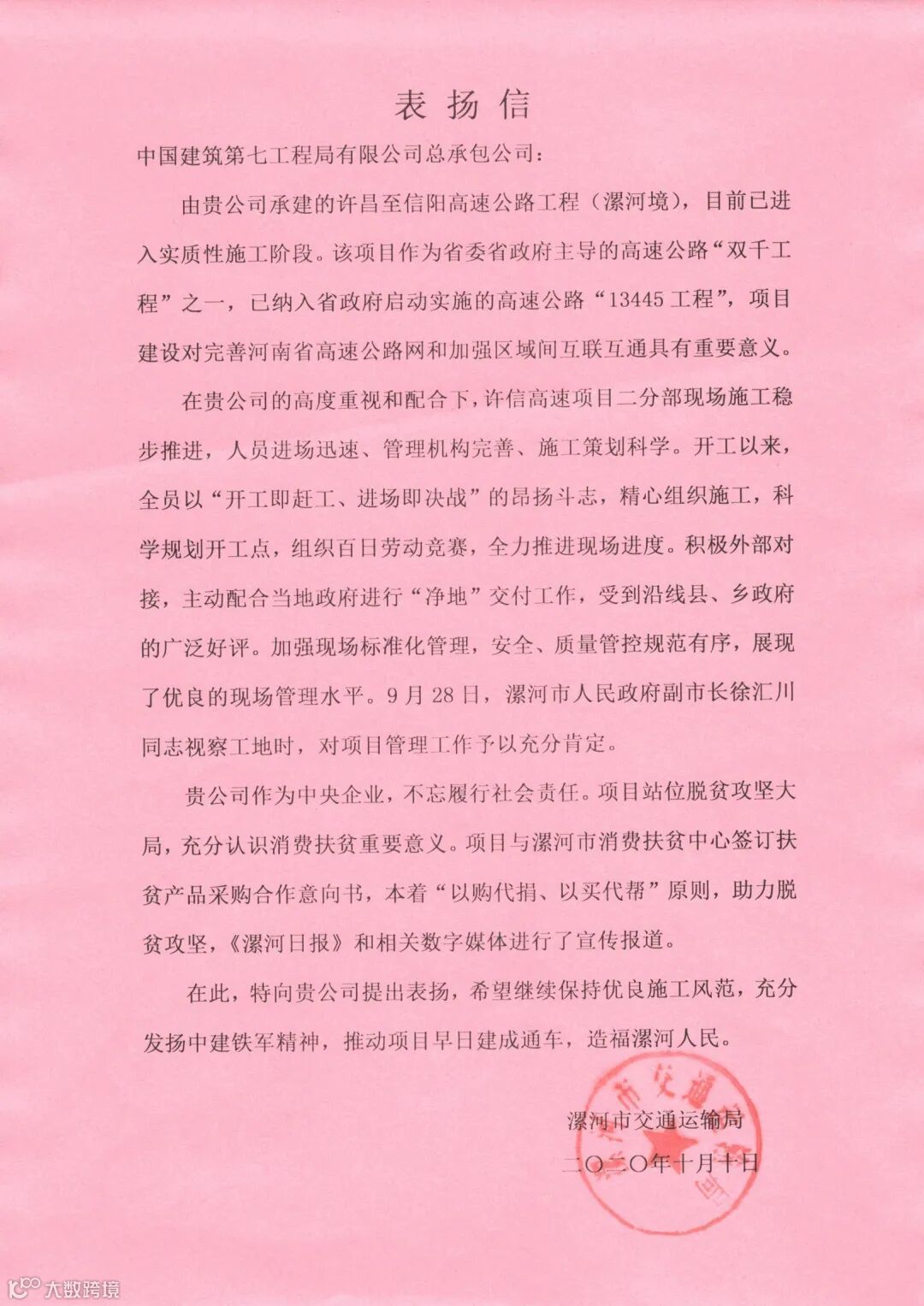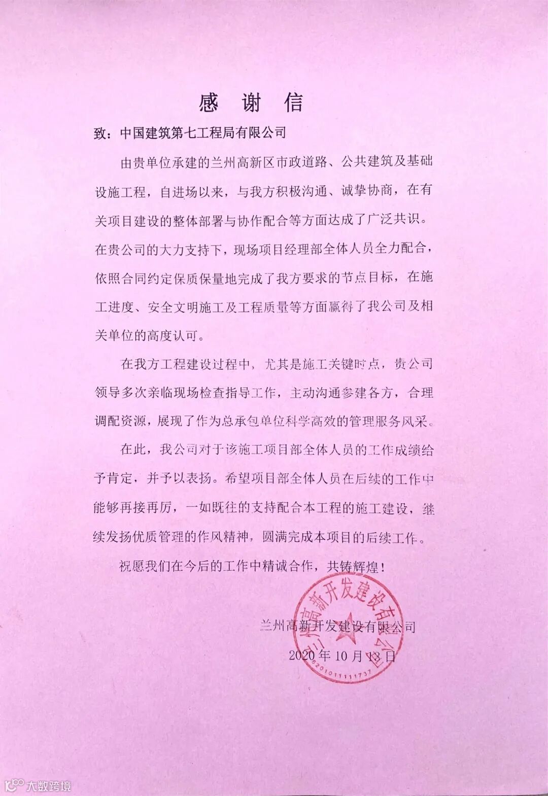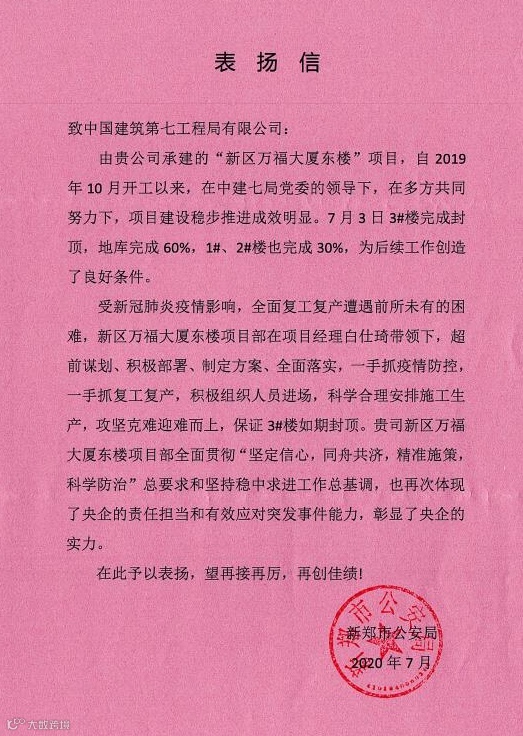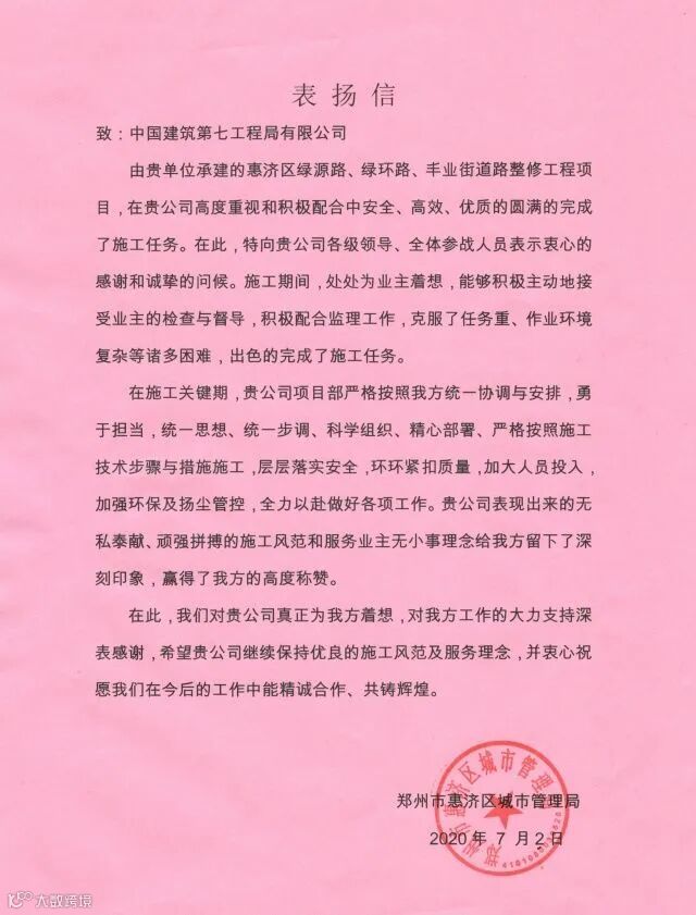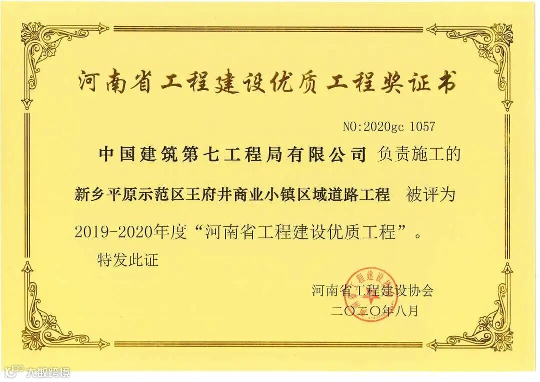 2020年,基础设施分公司坚持优质履约、以现场带动市场,所属项目部共获得表扬信4封,锦旗1面,新乡平原示范区王府井商业小镇区域道路工程荣获“河南省优质工程”荣誉,是公司首个获得河南省优质工程荣誉的市政项目。