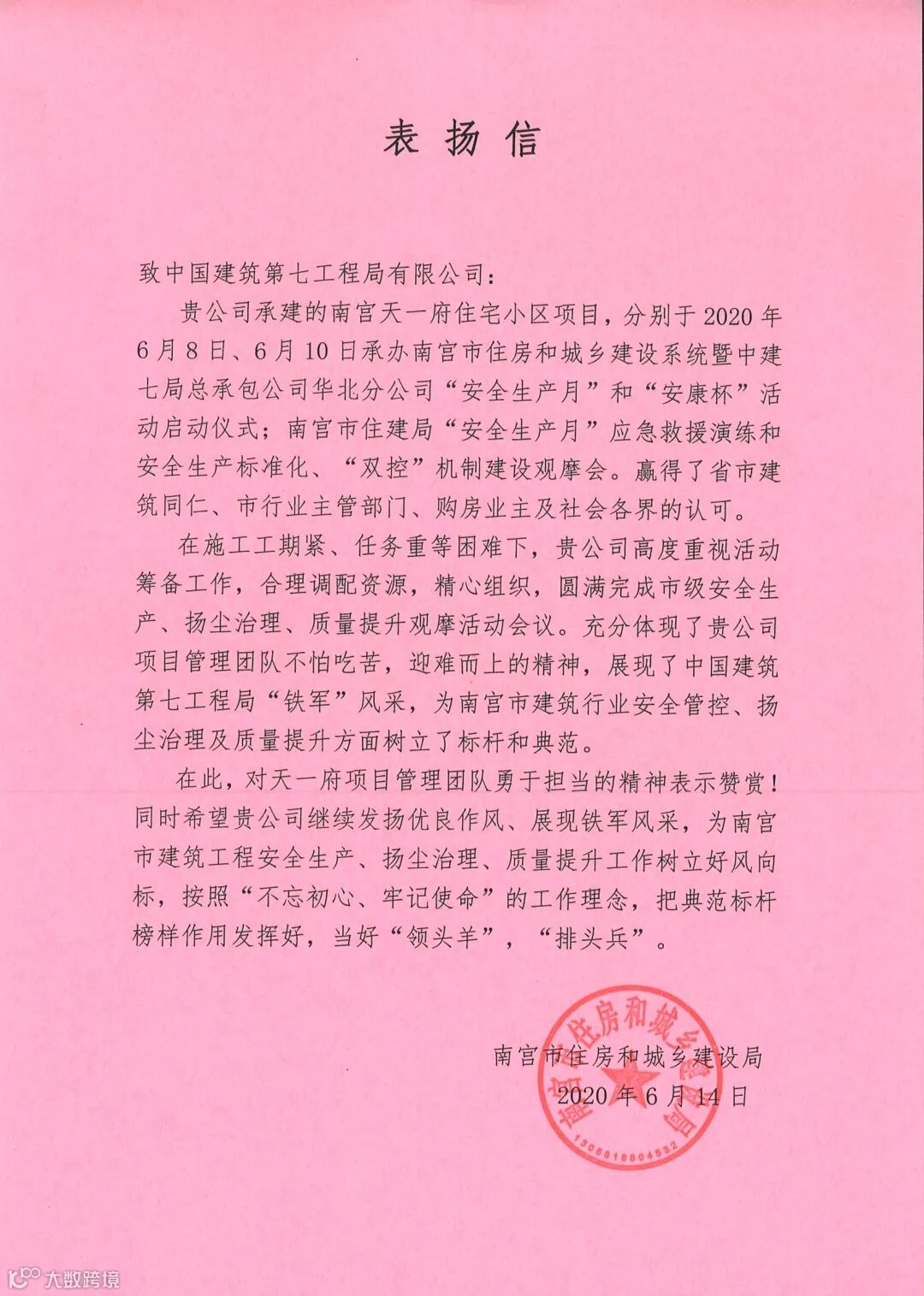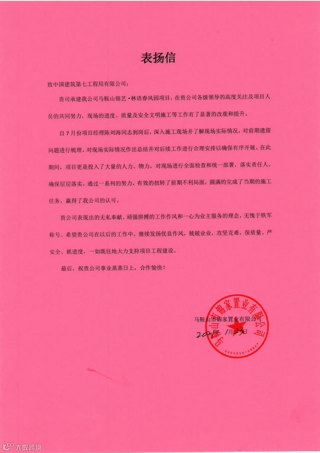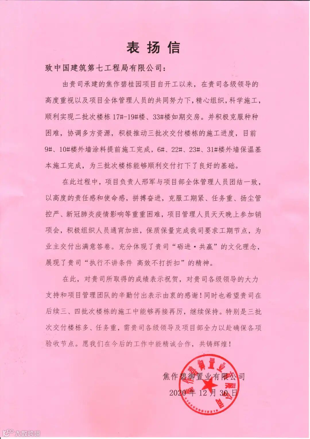 公司多个项目部受到甲方业主表彰