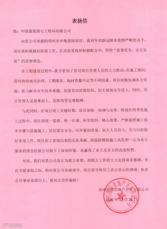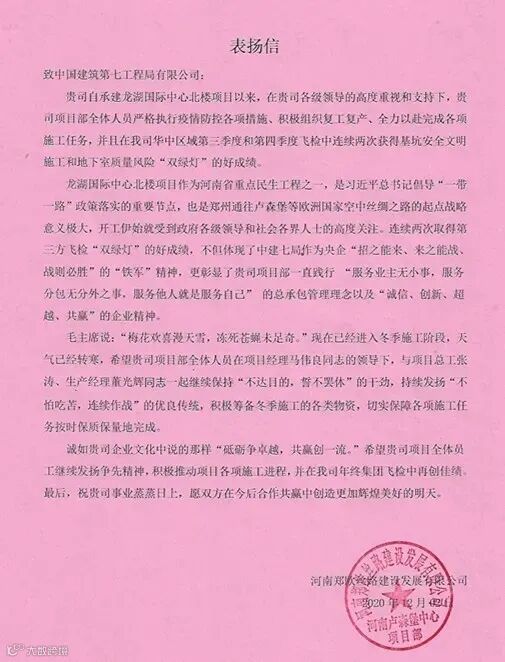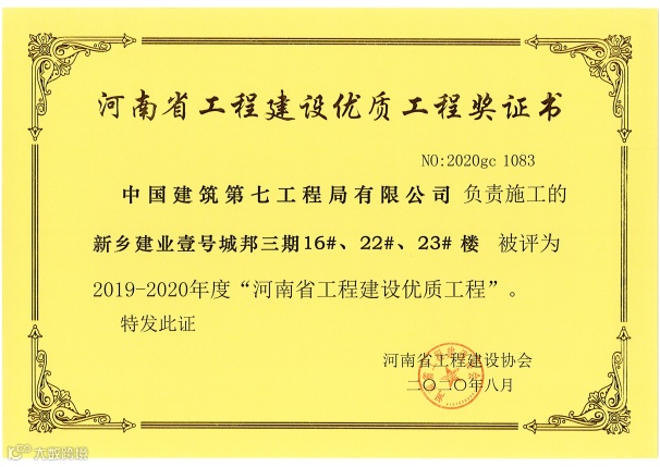 2020年河南分公司结合自身发展实际,聚焦品质提升,在危机中育新机,于变局中开新局。先后荣获国家级优质工程奖1项、中国安装工程优质奖1项,省级优质工程、省质量管理标准化工地、省优质结构工程、省级“工人先锋号”等各类省部级荣誉60余项,因优质履约获业主致信表扬47次,因主动承担社会责任获驻地单位送锦旗致谢2次。