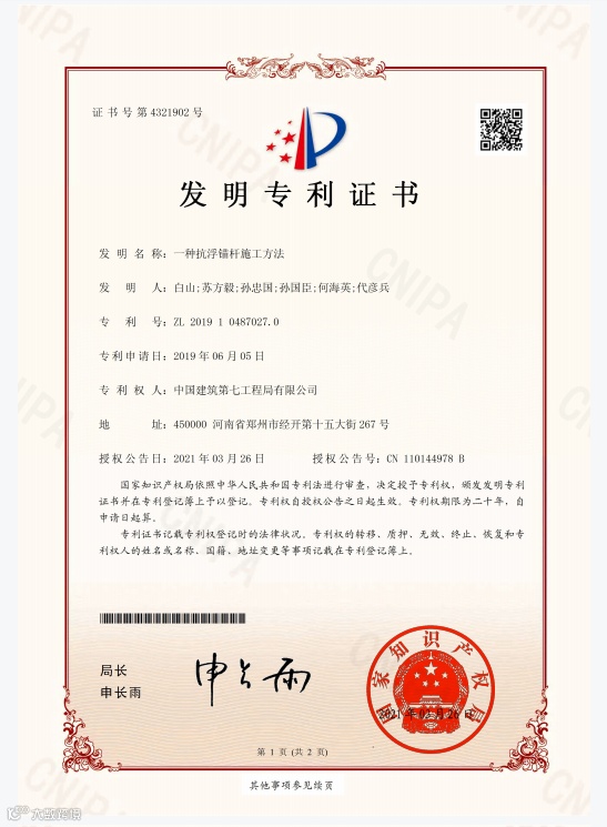 一种抗浮锚杆施工方法,采用改装振动沉管挤密碎石桩机作为锚杆机,有效地将地下水及泥沙层隔离在管壁外侧,从而避免了塌孔及地下水的影响;用吊钩在套管内吊入锚杆钢筋,边灌注注浆材料边振动拔管,利用拔管时振动使注浆材料振捣密实,同时采用多次灌注、加压注浆等方式注入浆料,保证了锚杆的成孔质量及砂浆强度;通过锚杆自带注浆管进行二次加压注浆。该成果降低了成本,缩短了工期、节省了材料、提高了质量,同时也会带来良好的社会效益。