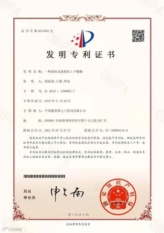 一种悬挂式深基坑上下楼梯,包括若干第一步道、若干第二步道、伸缩支撑部和若干悬挂部,该成果设计合理,加工制作及拼装方便,拼装高度可调且安全系数高,周转率高,经济实用,能解决现有深基坑上下通道存在的安全系数较低、人员上下基坑不便、扶梯占用基底面积大、移动不便等实际问题。