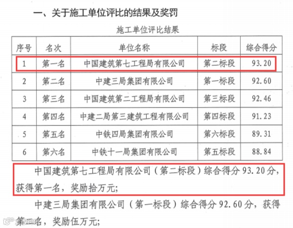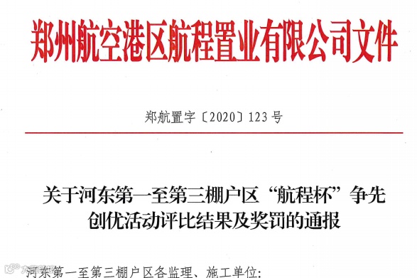 另外,由郑州航空港区航程置业有限公司主办的“航程杯”争先创优活动,于2020年9月底开展,三季度共六家中字头单位参比,中国建筑第七工程局有限公司(第二标段)综合得分93.20分, 获得第一名的好成绩。