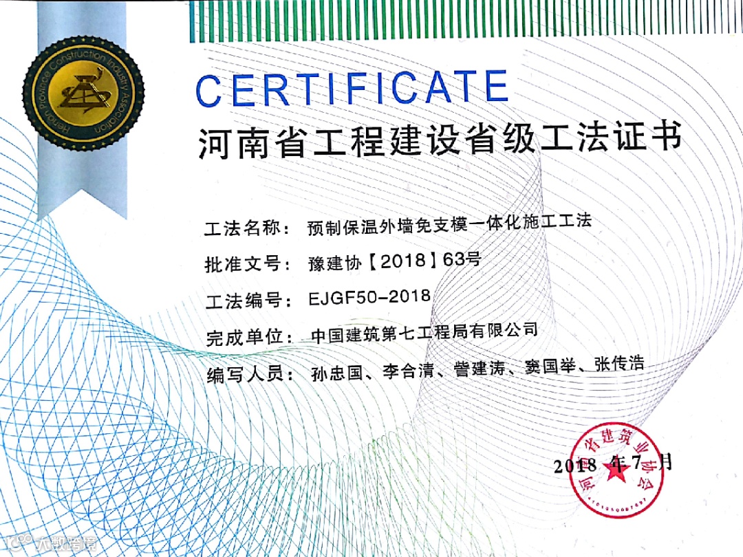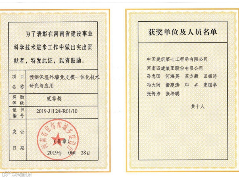 项目部申报立项了河南省绿色施工和新技术应用示范工地,以提升质量、降本增效为目标,开展了多项科技创新和新技术应用。4号地7号楼采用预制保温外墙板施工,保温板和保护层预制施工,混凝土质量达到清水混凝土效果,从工艺方法上完全避免了外墙混凝土浇筑可能产生的问题,该项工艺列入中建七局新技术名录,得到了参建各方和社会各界的认可。