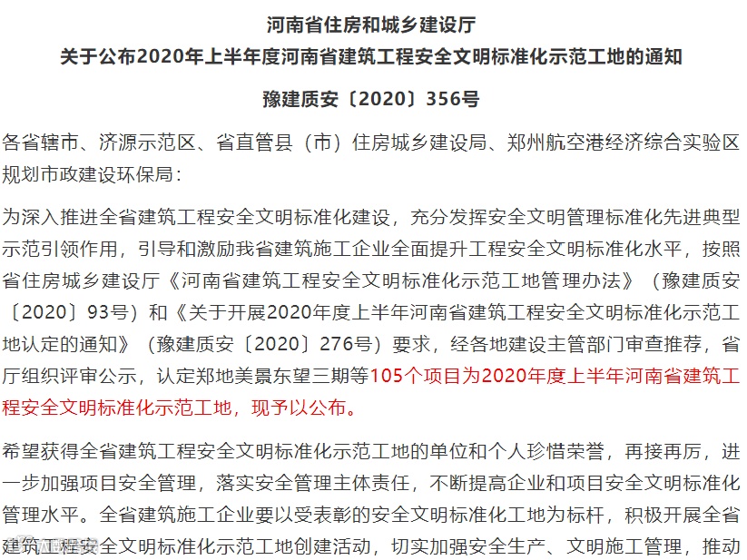 项目部高度重视安全生产工作,严格执行安全文明管理标准化相关规定,9月中旬,获评“河南省建筑工程安全文明标准化示范工地”。