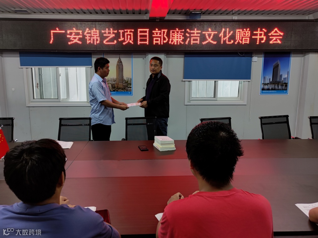 广安锦艺项目部开展廉洁文化读书会,每周分享廉洁小故事,项目经理向党员赠送廉洁书籍,强化党员干部的思想建设,树立“党风廉政建设永远在路上”的意识。