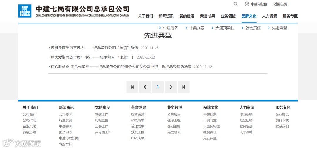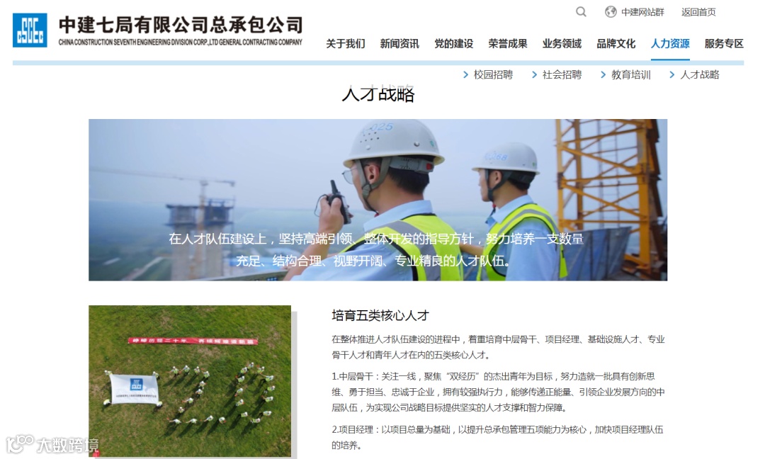 设置“公司简介、公司架构、企业文化、发展历程”四个子栏目,其中,“公司简介”包含集团公司简介、七局简介、公司简介;“公司架构”为企业组织机构图;“品牌文化”为七局励进·共赢文化体系介绍;“发展历程”为企业成立以来至今的大事记。