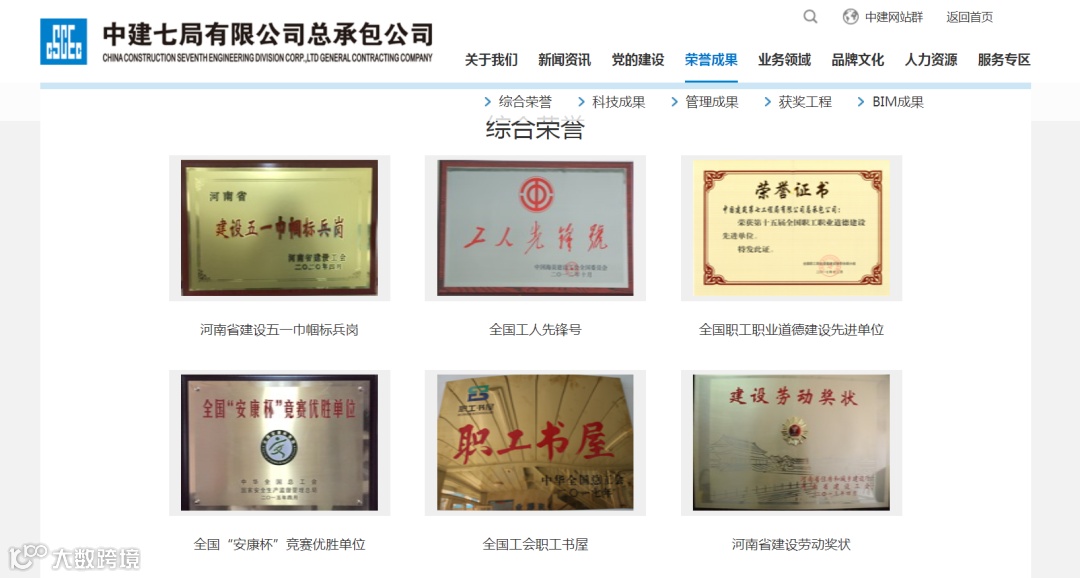 设置公司“综合荣誉、管理成果、科技成果、获奖工程、BIM成果”等五个子栏目,并将类别奖项进行展示。