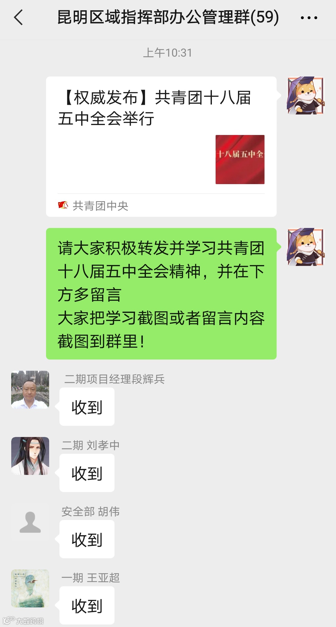 西南分公司97名青年通过线上学习、写留言、谈感想等方式参与到共青团十八届五中全会精神的学习当中。