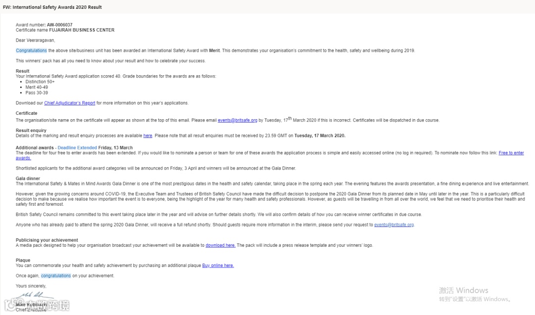 辛苦总会换取收获,中东分公司所属的三个阿联酋项目陆续获得“百万工时无事故奖”,富查伊拉商业中心项目还首次获得由英国安全委员会颁发的“国际安全奖”。