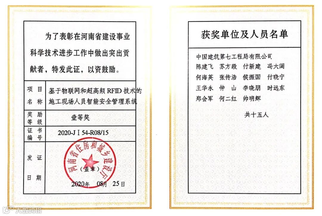 开展安全科技创新,先后开展3项局级安全科研课题研究,其中《基于物联网和超高频RFID技术的施工现场人员智能安全管理系统研究》在2018年港区二标全国砌筑大赛期间进行功能展示,得到各级领导及同行的一致好评,该研究获评2020河南省科学技术奖一等奖,为打造“安全智慧工地”奠定了良好基础。