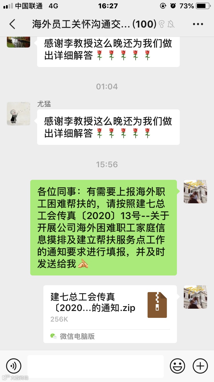 此外,为进一步加强公司工会对于海外职工的关怀力度,工会建立了海外员工关怀沟通交流群,一方面更有利于工会关怀工作的推进,另一方面也为近百名海外职工和专家提供了深入交流和答疑解惑的平台。