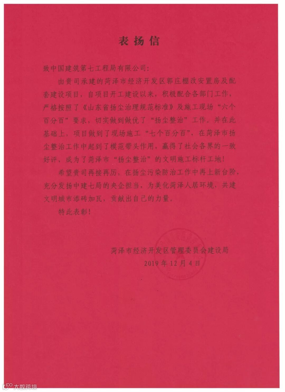 近日,中建七局总承包公司中原分公司菏泽经济开发区郭庄棚改安置房及配套建设项目收到菏泽市经济开发区管理委员会建设局的表扬信,信中对项目部开工以来在扬尘治理高压形势下攻坚克难,团结奋进,充分展现央企担当,在菏泽市扬尘整治工作中起到模范带头作用给予了高度肯定,赞扬项目为菏泽市“扬尘整治”文明施工标杆工地。
