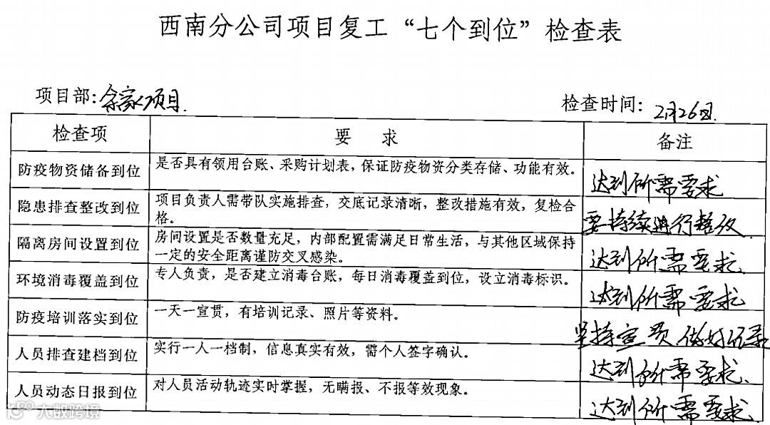 一是分公司纪检系统检查“抵一线”。分公司纪检监督办公室制定《项目复工“七个到位”检查表》,涉及防疫、复工两个方面共计7个检查项,先后3次深入4个项目检查防疫及复工工作,累计提出问题5个,整改完毕5个。
