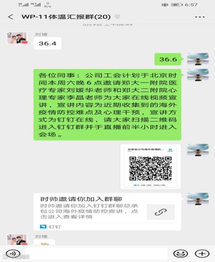 在公司的组织和支持下,邀请国内专业心理咨询师,定期通过网络开展心理疏导服务,为大家提供心理支持,送去企业关怀。及时对接公司,安排专人通过视频、电话等方式定期与海外员工家属联系,了解海外员工家属实际情况,通过公司帮助解决生活和工作中的实际困难,从实际行动上关心、关爱员工及家属,打消外派员工的担忧和顾虑,稳定思想情绪。