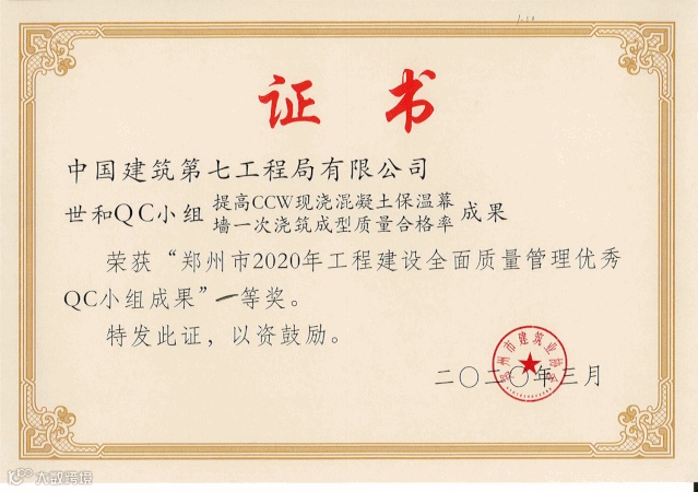 2020年3月获“郑州市2020年工程建设全面质量管理优秀QC小组成果”一等奖