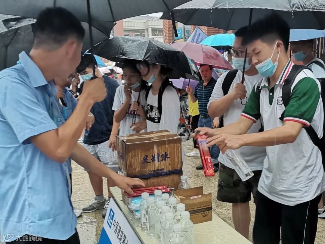 “哥哥姐姐,我们没有伞,能不能送我们到考点?”一个手拿准考证的考生焦急地问。