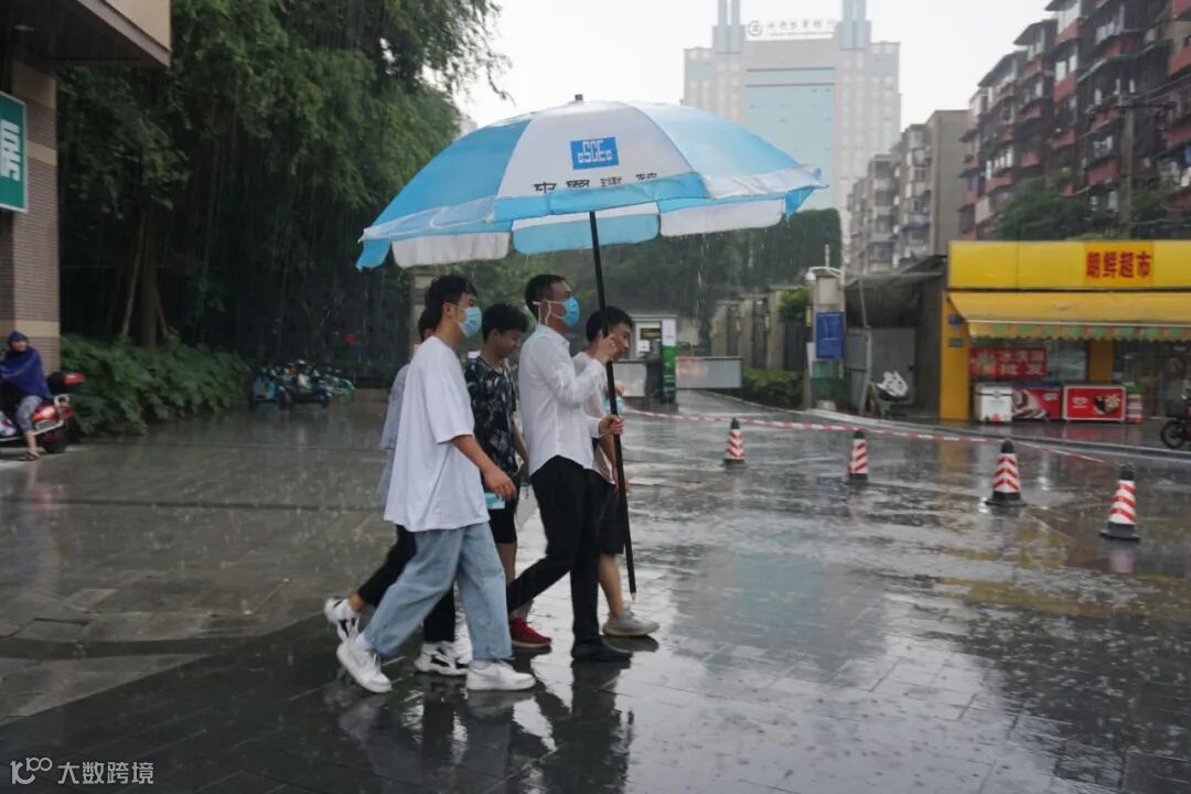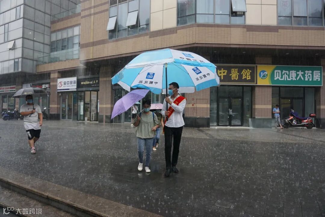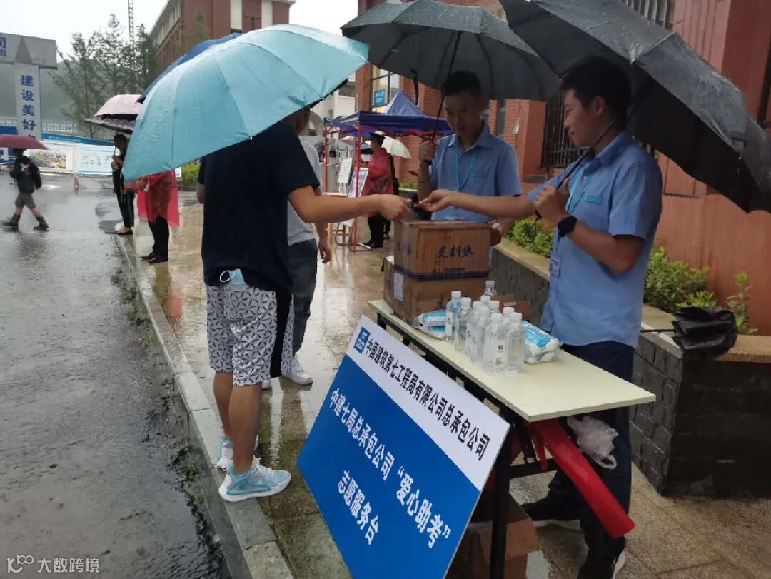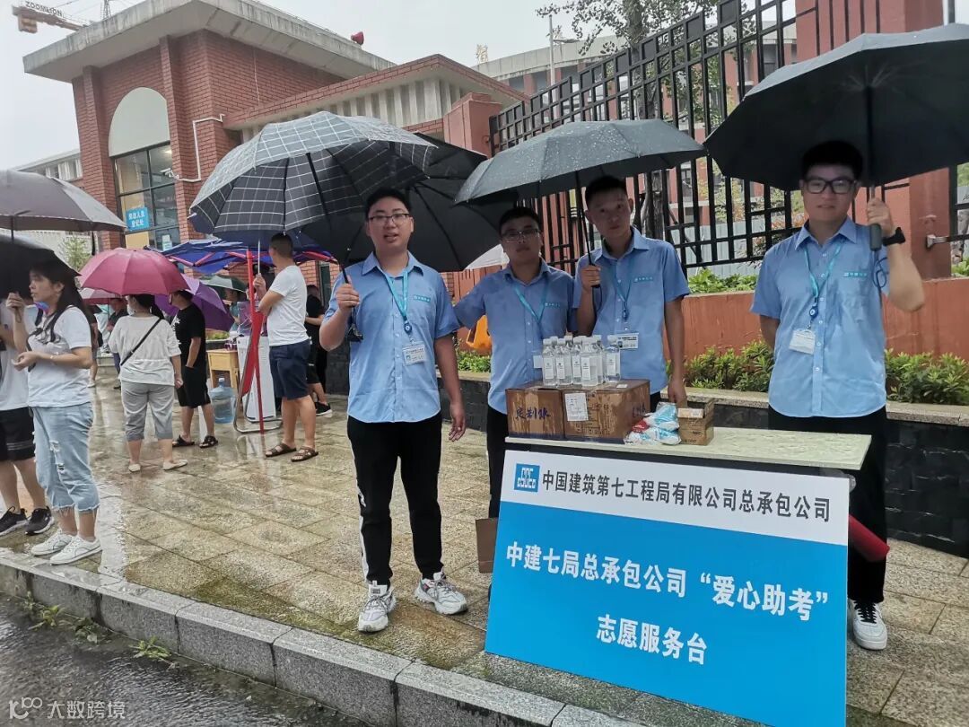 虽然雨水淋透了志愿者的衬衫、积水打湿了鞋子,但“中建蓝”却依然在风雨中坚定前行,祝他们旗开得胜、金榜题名!