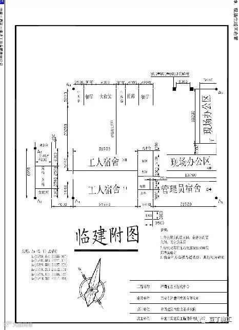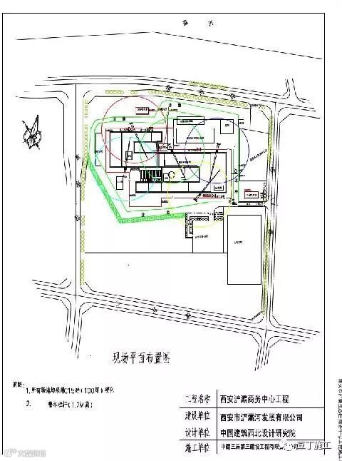 平面布置图十分简单,仅有建筑物外轮廓图、塔吊布置以及一些办公用房的布置,且没有比例。