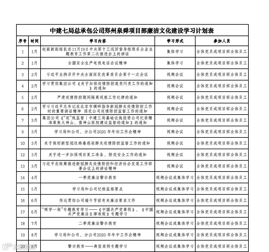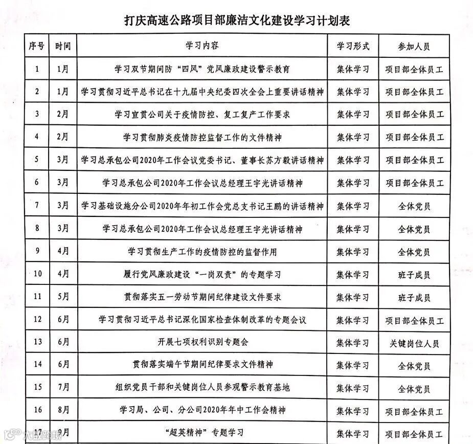 郑州泉舜、打庆高速公路项目廉洁文化建设学习计划表