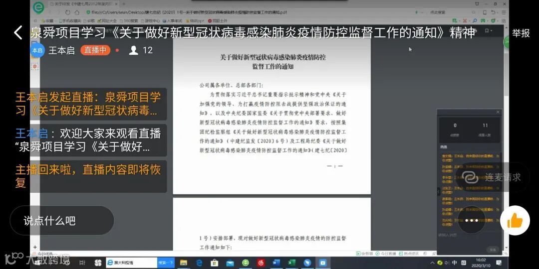 公司纪委持续推进超英精神学习宣贯活动常态化、长效化。一是完善全年学习计划,督促项目将疫情防控、复工复产等工作内容与日常教育学习相结合,加强理论知识的覆盖面;二是将疫情防控与超英先进事迹相融合,加大对超英精神“忠诚敬业、公而忘私、执纪严明、关爱群众”的宣贯力度,提升基层干部责任意识和担当精神;三是借助“互联网+”等新媒体,开展线上形式多样的学习宣教活动,在增强项目管理人员的纪律意识和规矩意识的同时,筑牢基层疫情防控防线。