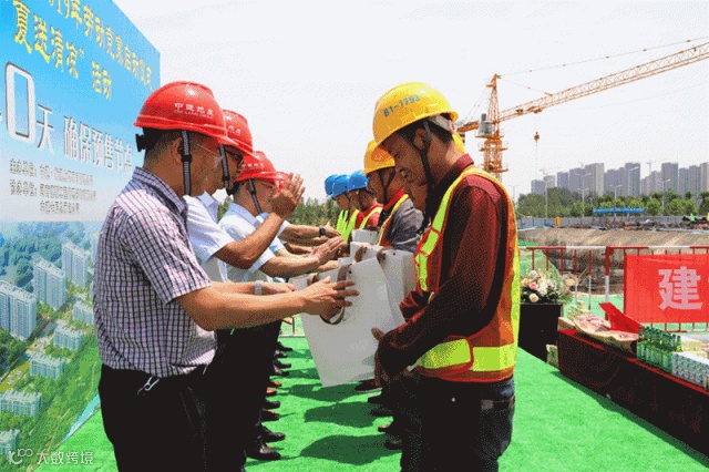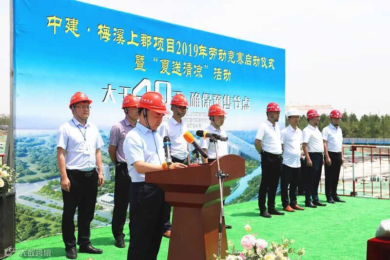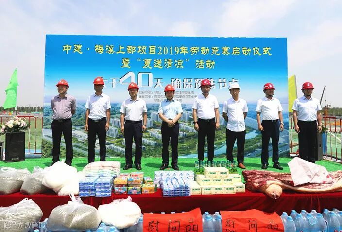 6月10日,中建·梅溪上郡项目部举办了“大干40天,确保预售节点”劳动竞赛启动仪式。总承包公司总经理王宇光,总承包公司党委副书记、工会主席李向阳,郑州中建地产公司党总支书记、董事长陈洪轩,郑州中建地产公司纪检委员、副总经理王金刚,郑州中建地产公司工会主席、总会计师郭广明,总承包公司中原分公司执行总经理刘东平、总承包公司中原分公司党委副书记、纪委书记、工会主席李阳,郑州中建嘉港公司总经理、工会主席李闯等出席会议,项目管理人员及工人代表共计150余人参加,仪式由中建·梅溪上郡项目公司总经理靳军主持。