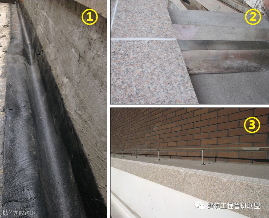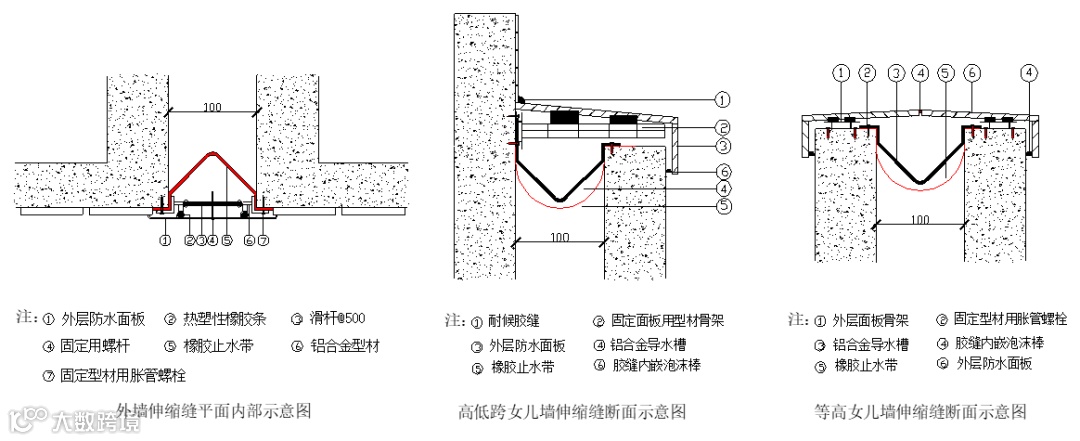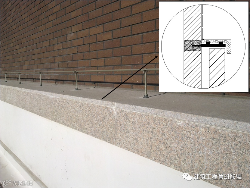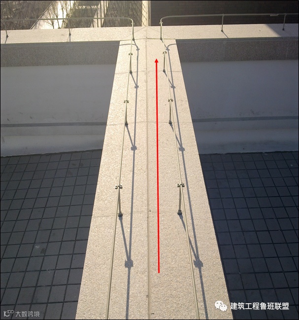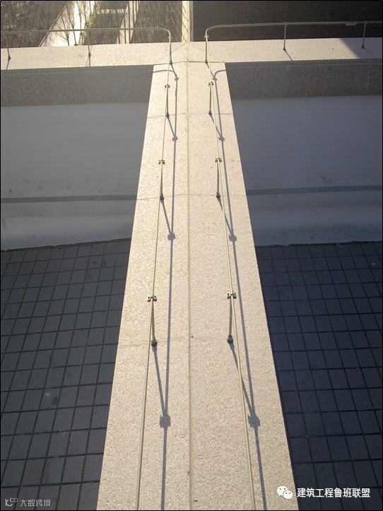 屋面伸缩缝是渗漏水的关键部位,做三道防水:底层粘贴防水布,中层做铝合金防水、导水槽,面层做石材面板防水。