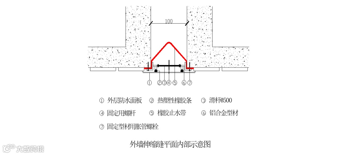 伸缩缝设计防水与抗变形能力的同时,同时将屋面与外墙防水层连通,通过二道铝合金导水槽以及底部防水布作用将一旦流入屋面伸缩缝内的雨水导出屋面,顺着外墙防水层导出室外,进一步提高了室外伸缩缝防水效果。