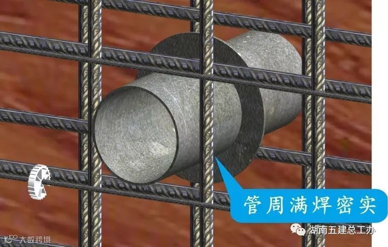 所有穿过防水混凝土的预埋件,必须满焊止水环,焊缝要密实无缝。环片净宽不小于40mm,大管径的套管不得小于80mm,安装时必须固定牢固,不得有松动现象。