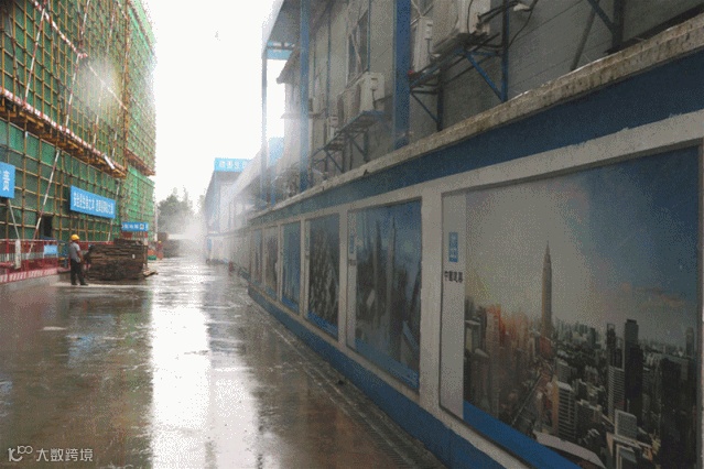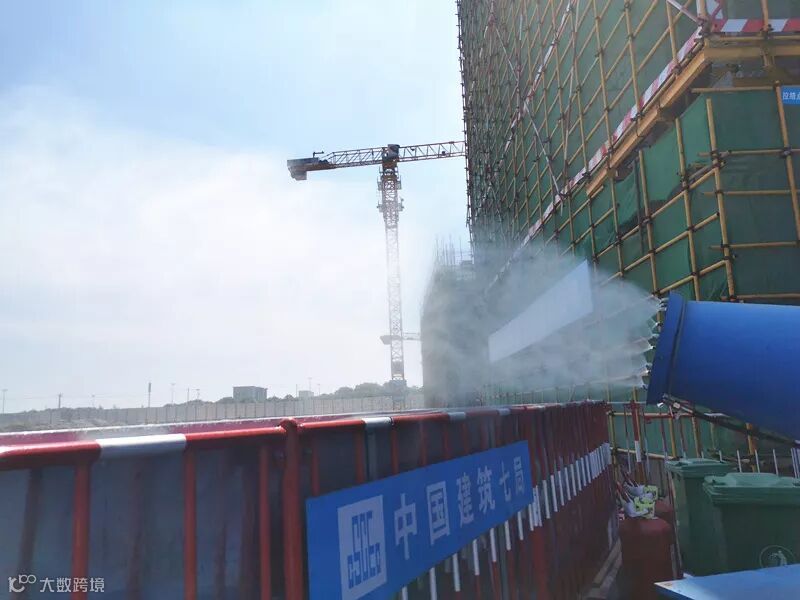 已经实现全覆盖的施工现场喷淋系统每小时启动一次,雾炮车、洒水车循环作业降温降尘。