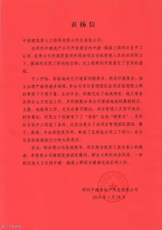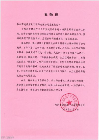 9月9日,总承包公司中原分公司中建·梅溪上郡项目(以下简称梅溪上郡项目)再次收到了甲方发来的感谢信,这是该项目今年收到的第2封感谢信了。数据显示,截止9月中旬,梅溪上郡项目共完成产值4790万元,其中,主体幼儿园(售楼部)已经提前封顶,7栋洋房、5栋高层提前完成节点目标,再次在航空港区打了一场漂亮的优质履约仗。
