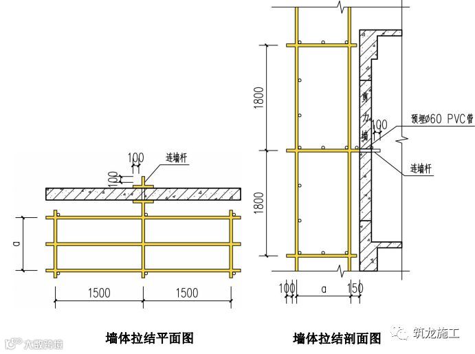 在剪力墙上预埋Ф 60 mm PVC管,a为800 mm或1050 mm (悬挑式脚手架为800 mm,落地式脚手架为1050 mm),通过预埋管拉通一根连墙杆与架体连接。