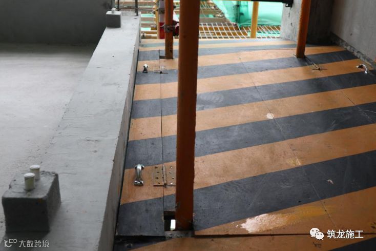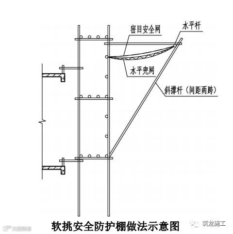 1. 搭设软挑时,软挑采用通长杆并用旋转扣件与脚手架连接作为斜撑杆,斜撑杆与外架倾斜角度为45°~60°,每两跨设置一道斜撑杆,斜撑杆顶部设置两道防护与外架连接,上下分别是密目安全网和水平兜网。