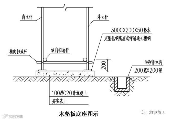 1. 落地式脚手架基础为回填土时,可采取两种做法,分别为12号槽钢底座和3000 mm×200 mm×50 mm木垫板底座。