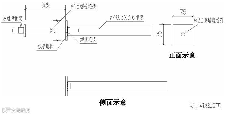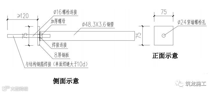 2. 混凝土浇筑前将预埋件埋入剪力墙或梁内(或设置穿墙螺栓孔),刚性连接件焊接螺母的一端套入预埋件(或穿墙螺栓),另一端通过扣件与脚手架立杆固定