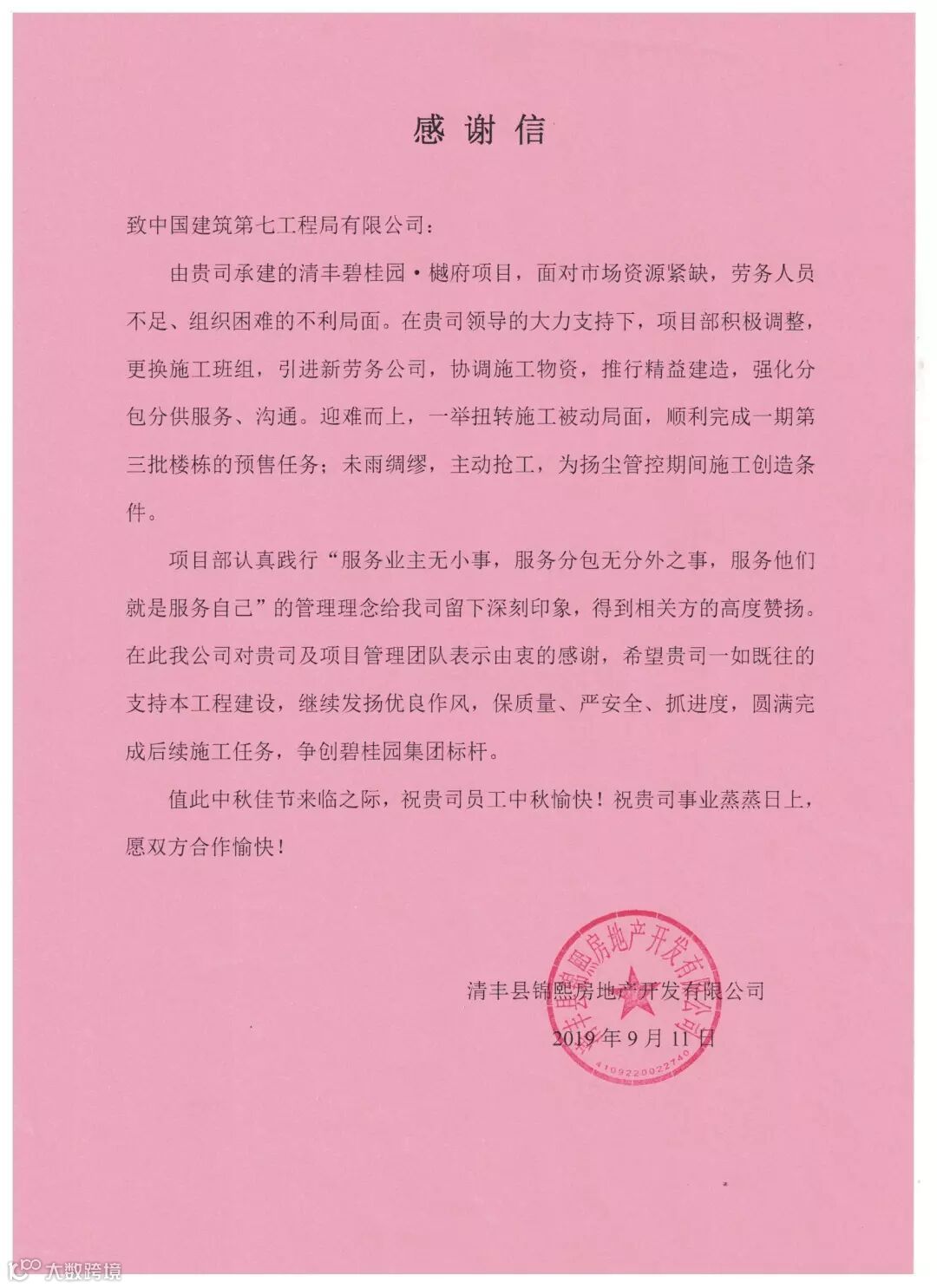 信中说道:“由贵司承建的清丰碧桂园· 樾府项目面对市场资源紧缺、劳务资源不足等不利因素,在贵司领导的大力支持下,克服多项困难,勇于担当,强化分包分供服务及沟通,迎难而上,一举扭转了施工被动局面,顺利完成了一期第三批楼栋的预售任务;未雨绸缪,主动抢工,为扬尘治理期间施工创造了条件……”
