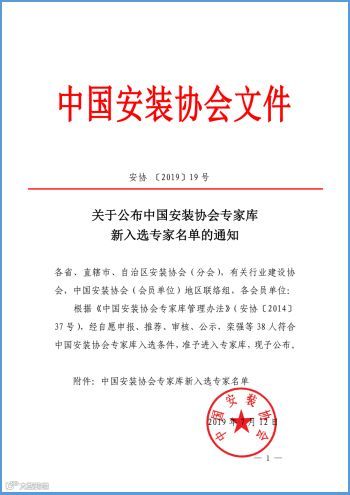 获评为中国安装协会专家