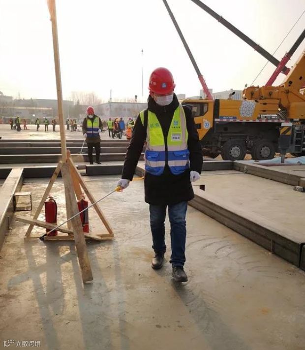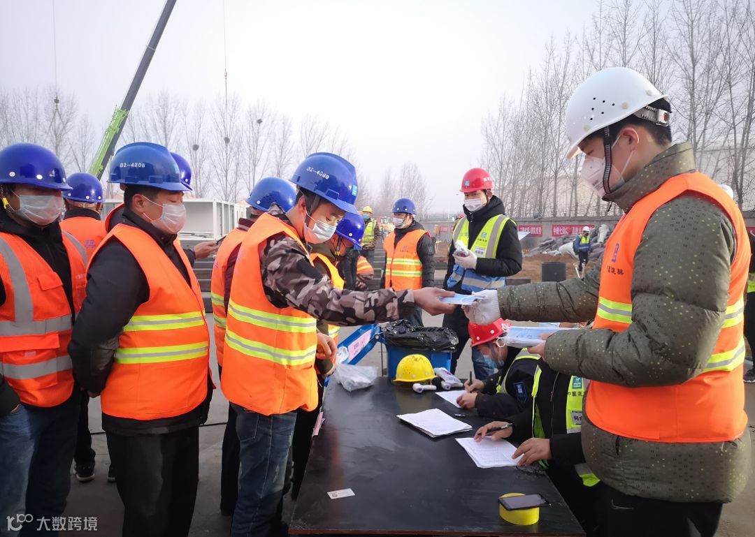 清晨为进场工人发口罩